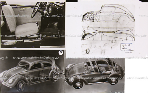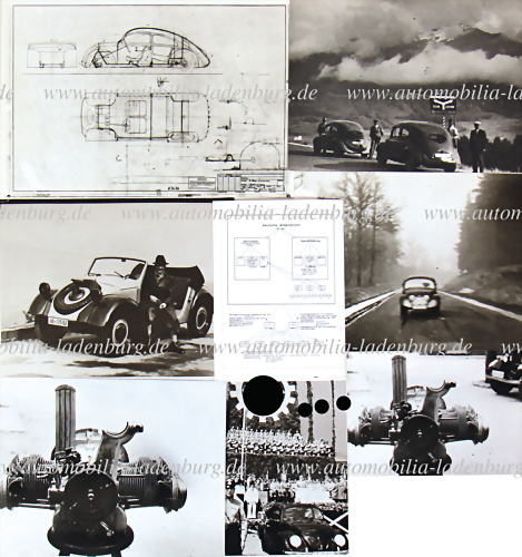 Konvolut 8 original s/w Aufnahmen, KDF Wagen, darunter Herbert Kaes mit Vorstufe Geländewagen Typ 62/82, Motor für Vorserie V3, Grundsteinlegung Volkswagenwerk 1938, Typ 60 von 1934 Konstruktionszeichnung Erwin Kommenda, versch. Formate