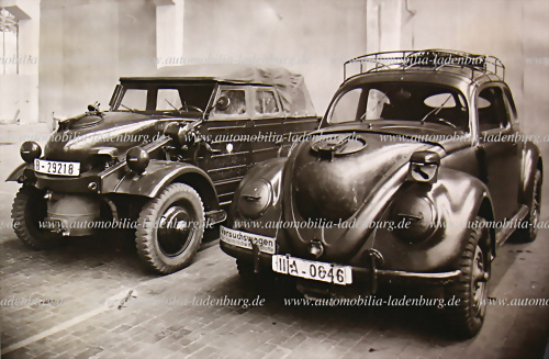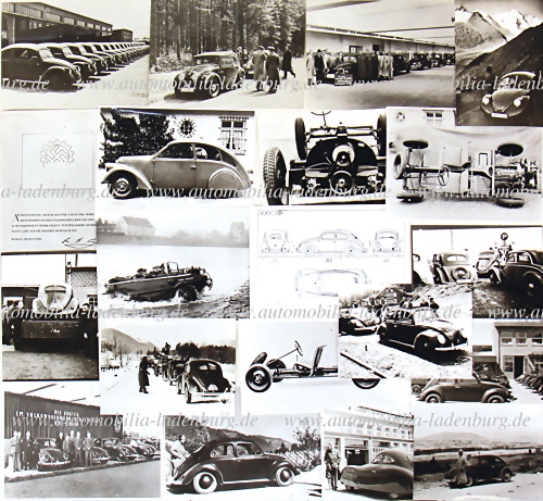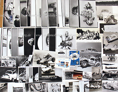 Konvolut 12 s/w Aufnahmen (überwiegend Originale), darunter Volkswagen Kübelwagen Typ 82 Feuerwehr, Typ 30 bei Daimler Benz, Versuchs Kübelwagen, Typ 64 (Berlin Rom Wagen), Zweizylinder Doppelkolbenmotor 1934...etc. verschiedene Formate