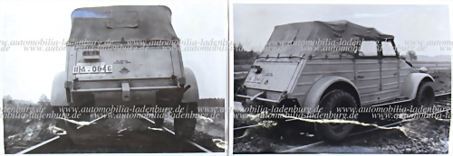 Konvolut zwei original Werksfotos (gestempelt Volkswagenwerk GmBH), Typ 82 Kübelwagen, Versuchsfahrzeug auf Schienen, 12,5x17cm