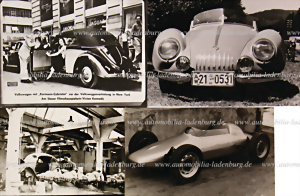 Konvolut 4 original s/w Aufnahmen darunter Karosserie Karmann Werksfoto "Karmann Cabriolet in New York"; Formel V Rennwagen; VW Cabriolet mit Spezial Karosserie, sowie Aufnahme Produktion KDF Wagen Versuchswagen bei Mercedes Benz, versch. Formate