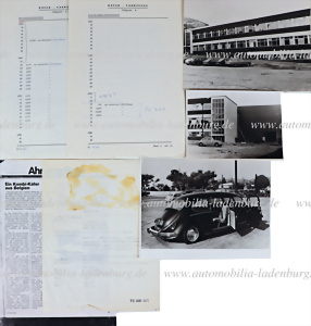 Archiv Ordner 40tlg. zur Käfer-Geschichte, darunter u.a. original Drehbuch zum Film "Ein Käfer auf Extratour" 1973 auf 160 Seiten; 12 Werksaufnahmen und 3 spätere Abzüge des Generaldirektors Heinrich Nordhoff u.a. mit Belegschaft '50er Jahre sowie Portraitaufnahmen; spätere Abzüge des Porsche Eintrags in Firmenregister 1931; zahlreiche Kopien u. original-Zeitungsauschnitte zur Entstehungsgeschichte KdF-Wagen 1938/1939; VW Mitteilungsblatt Nr. 19 1954; Abzüge v. Werksaufnahmen VW-100.000km Uhr, Münze u. Urkunde sowie 5 u. 10 Mio. Käfer Nordhoff Münze 1960er Jahre