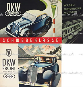 Konvolut 3tlg. darunter Verkaufsprospekt DKW Front 1923, Auto Union Programm 1937, Faltsprospekt DKW Schwebeklasse 1950, dt. Text