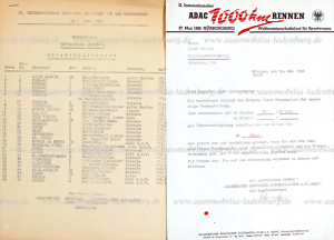 14. Mai 1956, Nennungsbestätigung ADAC 1000km Rennen Nürburgring, mit Startnummer, dazu 6 Seiten Ergebnisliste