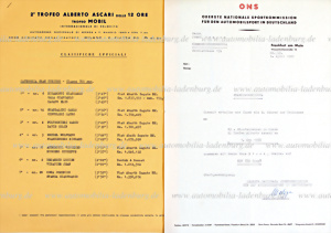 2. Trofeo Alberto Ascari / 12 Stunden Monza 1960, Konvolut 2tlg., darunter Startgenehmigung der ONS vom 9. April 1960, Sepp Greger und Hans Stuck auf BMW 700 Coupe, dazu 8 Seiten Ergebnisliste