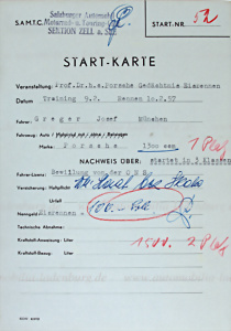1957, "Prof. Dr. h. c. Porsche Gedächtnis Eisrennen", Starterkarte Training, Sepp Greger belegte den ersten Platz in der Klasse bis 1300ccm und den zweiten Platz in der Klasse bis 1500ccm