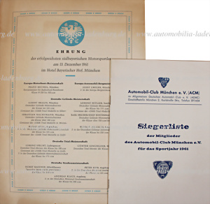 1961, Siegerliste der Mitglieder "Automobil Club München ", dazu Urkunde "Ehrung der erfolgreichsten südbayerischen Motorsportler", Sepp Greger Europa Bergmeisterschaft