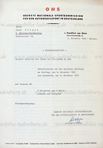 5. November 1963, ONS Startgenehmigung "Teilnahme an dem Rekordversuch auf der Autobahn Salzburg am 8. November 1963", dazu zwei Presseinformationen des Salzburger Automobil- Motorrad- und Touring-Club "...Sepp Greger - München (Porsche RSK 1800) verbessert den absoluten österreichischen Automobil Rekord auf 250,920 km/h"...