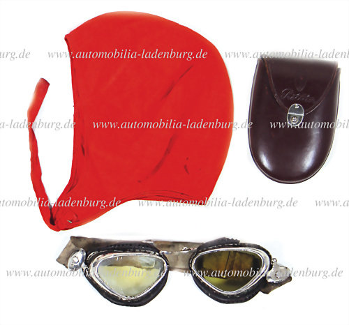 30er Jahre, rote Fahrerhaube und Protector Fahrerbrille im original Lederetui, die Fahrerbrille ist auf zahlreichen Abbildungen deutlich zu erkennen. Manfred von Brauchitsch verwendete diese Brille unter anderem bei Rennsportveranstaltungen auf Mercedes Benz SSK und SSKL sowie auf Mercedes W25, die... mehr