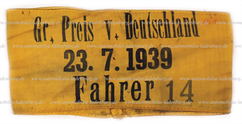 Großer Preis von Deutschland 1939, Fahrerarmbinde Manfred von Brauchitsch "Gr. Preis v. Deutschland 23.7.1939 Fahrer 14", Manfred von Brauchitsch auf Mercedes Benz W154, von Brauchitsch fiel aufgrund einer Tankbeschädigung aus...Sieger wurde Rudolf Caracciola auf Mercedes Benz.(Bestätigung über die... mehr