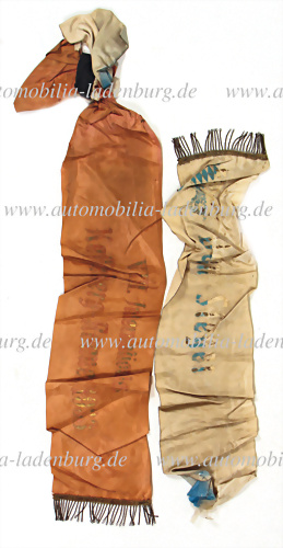 Konvolut zwei Siegerschleifen (jeweils nur ein Teil), Würgauer Bergrennen und ADAC Bergrekord 1933, Manfred von Brauchitsch Sieger auf Mercedes Benz SSKL, dazu Aufnäher "CIAPG" (Bestätigung über die Übergabe durch Manfred von Brauchitsch an den jetzigen Besitzer liegt vor)