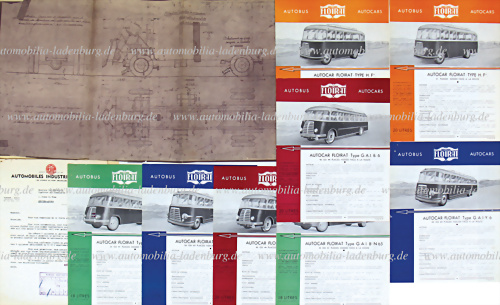 1950, Angebotsunterlagen, darunter Schreiben von Latil Brüssel an einen Interessenten für Floirat Omnibussen, dazu 8 Einblattprospekte Floirat Omnibusse, dazu Blaupause Karosserie Entwurf, franz. Text