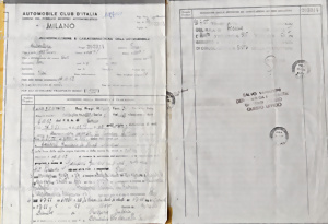 Registrierungsdokument des A.C.I., 4.Seiten (gestempelter Auszug 1986) Ferrari 195 Inter Motto Fastback Coupe (#0117S), das Dokument verzeichnet die Erstzulassung am 19.11.1952 unter dem Kennzeichen „MI 203314“, sowie die vollständige Eigentumshistorie bis 1957. Mit originalen Stempeln, Unterschriften und Beglaubigung des P.R.A Milano vom 15.07.1986, extrem selten