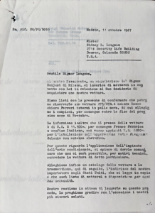 11.10.1967, original Schreiben (3 Seiten inkl. Übersetzung) von Ferrari Modena (von Enzo Ferrari persönlich in Auftrag gegeben ) an Sidney R. Langsam. Zu beginn schreibt Ferrari Modena „Mr. Sanjust aus Mailand informierte unseren Präsidenten, über Ihren Wunsch eines unserer Autos zu Kaufen“. Ferrari bestätigt hier die Reservierung eines Ferrari 275GTB/4 in „Rosso Ferrari“ mit schwarzem Lederinterieur zum Grundpreis von 11.500USD ab Werk und zusätzlich 280USD für die Installation eines Blaupunkt Radios, ebenfalls teilt Ferrari mit, dass eine Klimaanlage aus technischen Gründen leider nicht möglich sei. Zudem wird auf den offiziellen Ferrari-Importeur der USA Luigi Chinetti Motors Inc. verwiesen. Äußerst seltener Einblick in die Ferrari Verkaufsstrukturen der 60er Jahre