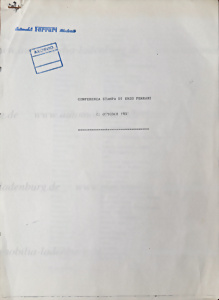 23.10.1981, werksinterner Entwurf der Pressekonferenz von Enzo Ferrari „Conferenza Stampa di Enzo Ferrari“ 21 Seiten, gestempelt „automobili Ferrari modena – Archivio“...seltener Vorentwurf mit hochinteressanten Details..."Enzo Ferrari sagt abschließend „Ich danke euch für eure Geduld… verzeiht meine sprachlichen Entgleisungen… ich beneide euch, weil ich gerne einer von euch wäre. Schreibt, was ihr wollt!“. Dies ist das werksinterne Manuskript letzten vollständig dokumentierten Pressekonferenz von Enzo Ferrari. Es dbeschreibt den Übergang von der Ära Forghieri zur Turboära Postlethwaite und die letzte große öffentliche Stellungnahme Enzo Ferraris. Ein extrem seltener Schlüsseltext zur Geschichte des Ferrari Motorsports in den frühen 80er Jahren