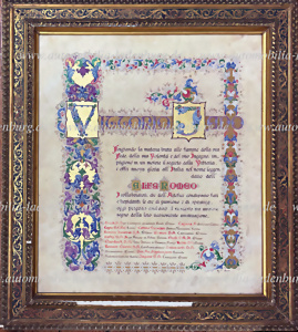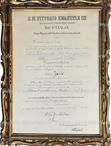 19. April 1930, gerahmte Urkunde "S.M. Vittorio Emanuele III Gran Mastro dell ´Ordine della Corona d´Italia "Commendatore", Vittorio Jano Alfa Romeo", Ernennung vom italienischen König Vittorio Emanuele III, Mussolini und Boselli zum "Commendatore", 46x36cm