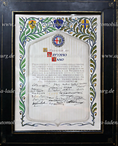 1932, Geschenk der Scuderia Ferrari (Enzo Ferrari) an Vittorio Jano, handgezeichnete Urkunde mit Handsignaturen aller Fahrer der Scuderia Ferrari mit folgender Inschrift "Dem Konstrukteur und Erbauer der Wagen, die in Europa- und Weltmeisterschaften zur hervorragenden Erringung des italienischen Sieges an den Start gingen : Die Scuderia Ferrari widmet ihm in ehrerbietiger Weise, im Namen der Fahrer - begierig nach Risiko und durstig nach Ruhm - Ihre dankbare Anerkennung dem unübertrefflichen Schöpfer, dem genialen Techniker, dem überaus treuen Bürger" - die Urkunde zeigt links oben das "Cavallino Rampante Logo, in der Mitte das Stadtwappen von Turin (Heimatstadt von Jano) und rechts das Stadtwappen von Modena, der stilisierte Kühler trägt das Alfa Romeo Logo (Kühleremblem) darunter haben sich insgesamt 27 Fahrer der Scuderia Ferrari verewigt, darunter Enzo Ferrari, Tazio Nuvolari, Piero Taruffi, Comotti, Pietro Ghersi, Mario Tadini, Guido D'Ippolito, Antonio Brivio, Giordano Aldrighetti, Eugenio Siena, Luigi Soffietti, Alessandro Bottoni, Giulio Ramponi, Piero Bucci, Carlo Bruno, G. Zaccarini, Baconin Borzacchini, Roberto Foligno, ...geschichtlich bedeutende Urkunde, Museumsqualität