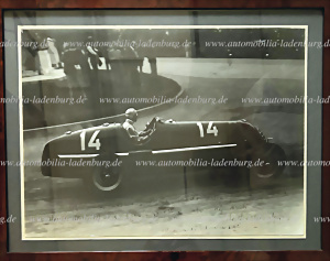 15. September 1935, Geschenk von Tazio Nuvolari an Vittorio Jano, handsignierte und gerahmte s/w Aufnahme mit Widmung "An Commendatore Vittorio Jano, zum Gedenken an den ersten Sieg seiner Schöpfung, des Alfa Romeo 3800 (8C-35) mit Einzelradaufhängung" anlässlich Vierfachsieg der Scuderia Ferrari und dem ersten Platz für Tazio Nuvolari, 30,5x49,5cm