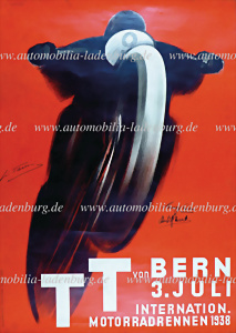 Veranstaltungsplakat zum legendären TT Rennen Bern 1938, gestaltet von Ernst Ruprecht, der wie kaum ein anderer die Faszination und Dynamik des Motorsports in seinen Arbeiten festzuhalten vermochte. Die krafvolle Komposition mit dem rasenden Motorrad Rennfahrer zählt zu den eindrucksvollsten Beispielen europäischer Plakatkunst der Vorkriegszeit. Dieses extrem seltene Exemplar in deutscher Sprache ist zudem von drei Motorrad Weltmeistern handsigniert: Umberto Masetti (Weltmeister auf Gilera 1950 und 1952), Geoff Duke (Weltmeister 1951 und 1952 - Norton und 1953-1955 auf Gilera), Luigi Taveri (Weltmeister 1962, 1964 und 1965 auf Honda). Ein außergewöhnliches Sammlerstück und ein bedeutendes Zeugnis der internationalen Motorradgeschichte, 127x90cm, sehr guter Zustand (auf Leinen)