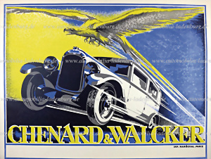 ca. 1928, Werbeplakat, Entwurf von André Lagache für den französischen Automobilhersteller Chenard & Walcker. Das Plakat vereint Geschwindigkeit und Eleganz in einer einzigen dynamischen Komposition. In dieser Größe und Erhaltung äußerst selten und von beeindruckender Präsenz, 120x159cm (auf Leinen), sehr guter Zustand