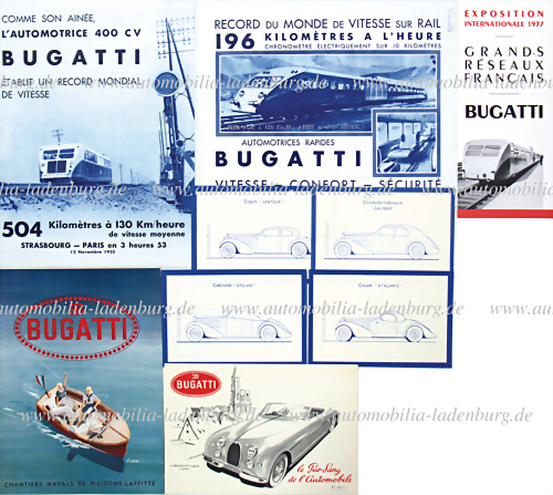 Konvolut 9tlg., darunter Faltprospekt Typ 101, Exposition 1937 Bugatti "Automotrices Rapides", Bugatti Boot "2 / 5 CV", dazu 4 Einblattprospekte Karosserievarianten "Galbier", "Atalante"...guter Zustand