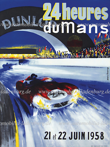 Veranstaltungsplakat 24h Le Mans 21/22.Juni.1958, wunderschöner Entwurf von Beligond, Rennsportwagen in voller Fahrt unter der Dunlop Brücke, 38x29cm, guter Zustand