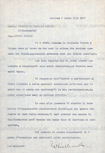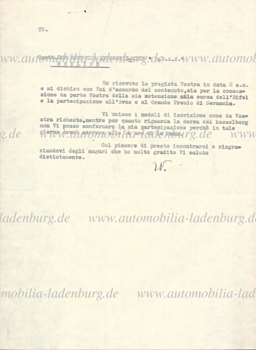 1933, Schreiben von Tazio Nuvolari an den DDAC, darin bestätigt Nuvolari den Erhalt eines Schreibens vom 8. des Monats und erklärt sein Einverständnis mit dem Inhalt – insbesondere mit seiner Nichtteilnahme am Eifelrennen, sowie seiner Teilnahme an den Rennen auf der Avus (auf Alfa Romeo Typ Monza... mehr