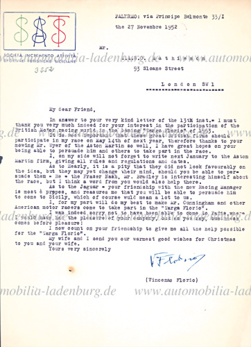 1952, handsignierter Brief von Vincenzo Florio an Taso Mathieson, hier bedankt sich V. Florio für das Interesse der britischen Motorsportwelt an der kommenden Targa Florio 1953..., datiert 27.11.1952