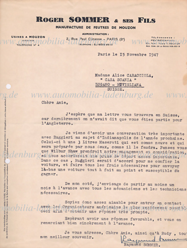Handsigniertes Schreiben von Raymond Sommer (1906–1950) an Alice Caracciola, hier entwirft der französische Grand-Prix-Pilot seine ehrgeizigen Pläne für ein transatlantisches Engagement bei den 500 Meilen von Indianapolis.Sommer berichtet von einem Gespräch mit Ruggieri, dem Eigentümer eines... mehr