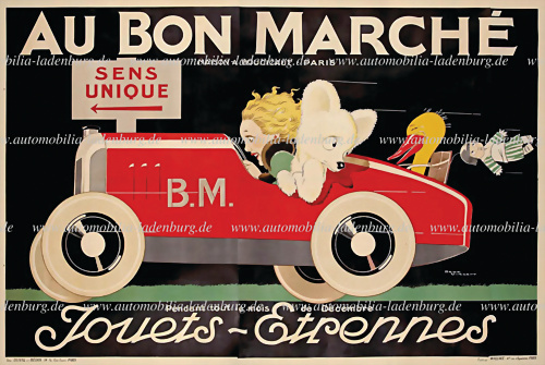 ca. 1920, Werbeplakat "Au Bon Marché - Spielwaren und Spiele", außerordentlich seltenes, großformatiges Werbeplakat des französischen Künstlers René Vincent, geschaffen in den 20er Jahren für das berühmte Pariser Kaufhaus Au Bon Marché. Das Motiv zeigt ein Kind, das ein Tretauto lenkt, begleitet von... mehr