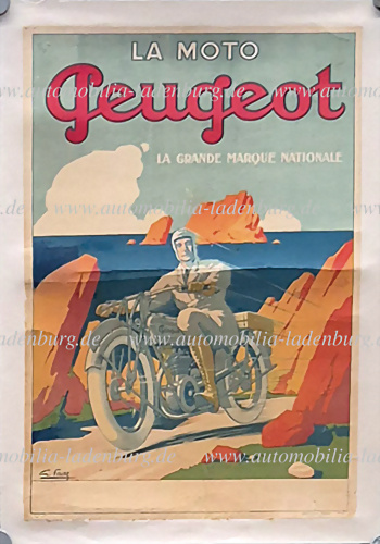 Ende 20er Jahre, original Werbeplakat "La Moto Peugeot - La Grand Marque Nationale", Entwurf G.Favre, 60x40cm, professionell auf Leinen gezogen, einige Falt- und Knitterspuren sichtbar, ansonsten guter Zustand, selten