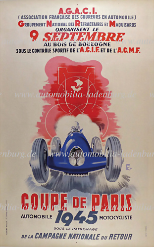 Veranstaltungsplakat "Coupe de Paris", erstes Automobil- und Motorradrennen nach dem zweiten Weltkrieg, ausgetragen im Bois de Boulogne in Paris. Das Werk stammt von Jean Luc und zeigt die charakteristische grafische Eleganz der unmittelbaren Nachkriegszeit. Der Sieger des Hauptrennens wurde Jean... mehr