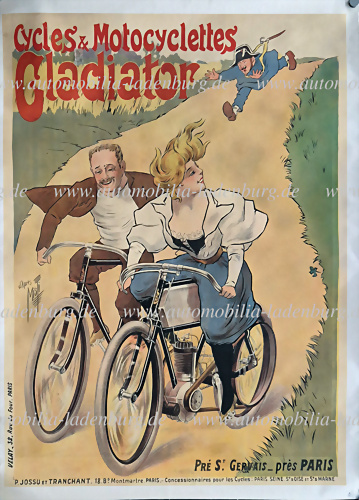 1897, original Plakat "Cycles & Motocyclettes Gladiator" von Misti (Ferdinand Mifliez) für den französischen Hersteller Gladiator. Das humorvolle und lebendige Motiv zeigt ein Paar auf Fahrrädern, das einem Gendarmen entflieht – eine typische Szene aus Mistis heiterer und zugleich elegant... mehr