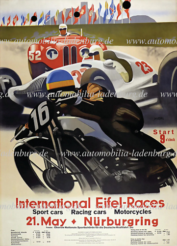 1935, original Veranstaltungsplakat "Internationales Eifelrennen auf dem Nürburgring 16.Juni.1935, Entwurf von Stürmer, 68,5x47,5cm, aufgezogen auf Hartfaserplatte, rechte obere Ecke mit kleineren Abriebstellen, ansonsten guter Zustand, selten