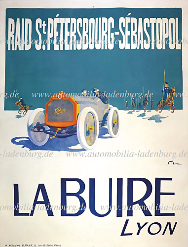 1911, seltenes Plakat von mit einem Entwurf von Ernest Montaut, entstanden zur Erinnerung an die außergewöhnliche Fernfahrt St. Petersburg - Sewastopol. Diese über 3000km lange Fernfahrt galt als eine der härtesten automobilen Prüfungen ihrer Zeit. Zwei Serienfahrzeuge der französischen Marke La... mehr