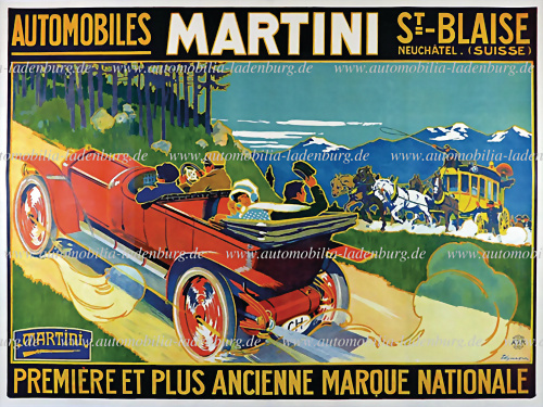 um 1910, außergewöhnlich seltenes Werbeplakat, Entwurf von Edouard Elzingre für den Schweizer Automobilhersteller Martini. Mit einer eindrucksvollen Darstellung eines rasenden offenen Martini Tourenwagens, während ein Polizist eine Postkutsche anhält um den Wagen passieren zu lassen. Ein... mehr