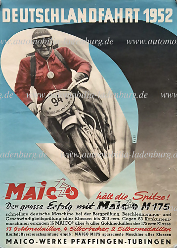 Original Rennplakat "Deutschlandfahrt 1952 - Maico hält die Spitze - Der große Erfolg mit Maico M175, Entwurf Russ, 83,5x59,5cm