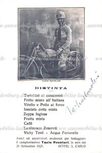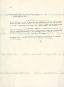 1933, Schreiben von Tazio Nuvolari an den DDAC, darin bestätigt Nuvolari den Erhalt eines Schreibens vom 8. des Monats und erklärt sein Einverständnis mit dem Inhalt – insbesondere mit seiner Nichtteilnahme am Eifelrennen, sowie seiner Teilnahme an den Rennen auf der Avus (auf Alfa Romeo Typ Monza der Scuderia Ferrari) und beim Großen Preis von Deutschland.Beigefügt übersendet er die erbetenen Meldeformulare und teilt zugleich mit, dass er am Kesselbergrennen nicht teilnehmen könne, da er am selben Tag bei den 24 Stunden von Le Mans starten werde. Abschließend dankt er für die übermittelten Glückwünsche und äußert die Freude auf ein baldiges Wiedersehen. Mit Kürzel signiert