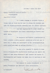 1934, Schreiben von Tazio Nuvolari (1892–1953) an Anthony Noghès, Gründer des Automobile Club de Monaco und Initiator des Grand Prix von Monaco.Nuvolari berichtet, dass er sich seit zwei Monaten in Mailand aufhalte, um die Operation seines Sohnes abzuwarten, die am Vortag mit ausgezeichnetem Ergebnis verlaufen sei. Aufgrund dieser Umstände bittet er höflich um Nachsicht für seine verspätete Antwort auf das Schreiben des Empfängers.Er dankt Noghès herzlich für die Einladung zur Teilnahme am Großen Preis von Monaco sowie für die gewährten besonderen Bedingungen, und bestätigt seine Teilnahme für 1934 – diesmal auf einem Bugatti.Dem Schreiben legt Nuvolari das ordnungsgemäß unterzeichnete Nennungsformular bei und kündigt an, die technischen Details seines Fahrzeugs nachzureichen, sobald Meo Costantini, der damalige Leiter des Bugatti-Werksteams, über den genauen Fahrzeugtyp entschieden habe.Der Brief endet mit freundlichen Grüßen und der Vorfreude auf ein baldiges Wiedersehen in Monaco, handsigniert Nuvolari