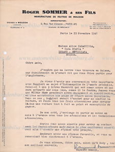 Handsigniertes Schreiben von Raymond Sommer (1906–1950) an Alice Caracciola, hier entwirft der französische Grand-Prix-Pilot seine ehrgeizigen Pläne für ein transatlantisches Engagement bei den 500 Meilen von Indianapolis.Sommer berichtet von einem Gespräch mit Ruggieri, dem Eigentümer eines nahezu neuen Maserati 3 Litri, den beide gemeinsam für den Start in den Vereinigten Staaten vorbereiten wollten. Der Brief offenbart Sommers strategisches Denken, seine technischen Ambitionen und die Bedeutung internationaler Kontakte im Vorkriegs-Motorsport. Er bittet Alice Caracciola, über ihre Beziehungen in der amerikanischen Rennszene – namentlich zu Wilbur Shaw, dem späteren dreifachen Indy-500-Sieger – eine angemessene Startprämie und organisatorische Unterstützung zu sichern, datiert 15.November.1947, inkl. s/w Aufnahme / Portraitaufnahme