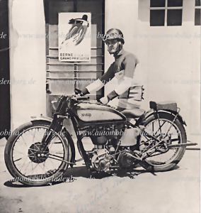 Handsignierte s/w Aufnahme Amilcare Rossetti auf Norton, Grand Prix Suisse 1935, 16,8x17,8cm
