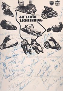 Mehrfach signierte s/w Aufnahme "40 Jahre Sachsenring", mit mehr als 30 Signaturen u.a. Heinz Rosner, Bill Ivy, Bill Neslon, Giacomo Agostini, Mike Hailwood, Jim Redman, Karl Hoppe, Phil Read, Mike Duff Giola Marzikovski, P.Stastny, Ralph Bryanz, W.Woodmann, Nieto, Ginger Malloy, Joe Dunlop, Gustav Havel, Karl Braun, Paul Löffler, Rolf Becker, W.Schulze, Manfred Gräf, Klaus Enderlein, Ewald Kluge, Werner Greizu, Hans Weber, H.Hoffmann, Karl Berthl, H.Barth, U.Friedel, R.Vogel, Scheidegger, 29x24cm