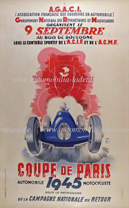 Veranstaltungsplakat "Coupe de Paris", erstes Automobil- und Motorradrennen nach dem zweiten Weltkrieg, ausgetragen im Bois de Boulogne in Paris. Das Werk stammt von Jean Luc und zeigt die charakteristische grafische Eleganz der unmittelbaren Nachkriegszeit. Der Sieger des Hauptrennens wurde Jean Pierre Wimille auf Bugatti T50. Das Plakat wird zusammmen mit einem originalen Veranstaltungsprogramm angeboten. Ein äußerst seltenes Sammlerstück - bislang ist nur dieses Exemplar bekannt. 160x100cm, sehr guter Zustand (auf Leinen), Rarität