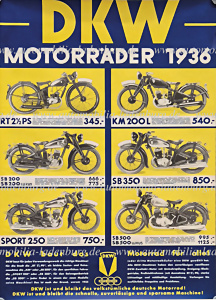 Original Werbeplakat "DKW Motorräder 1936" Modellprogramm mit Preisen u.a. RT 2 1/2PS, KM 200L, SB 350..., 99,5x69,5cm