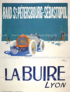 1911, seltenes Plakat von mit einem Entwurf von Ernest Montaut, entstanden zur Erinnerung an die außergewöhnliche Fernfahrt St. Petersburg - Sewastopol. Diese über 3000km lange Fernfahrt galt als eine der härtesten automobilen Prüfungen ihrer Zeit. Zwei Serienfahrzeuge der französischen Marke La Buire bewältigten das Rennen ohne Strafpunkte und belegten die ersten Plätze vor 63 Konkurrenten - ein bemerkenswerter Erfolg für die damals in Lyon ansässige Firma. Montauts Entwurf überzeugt durch seine klare, kraftvolle Bildsprache und symbolisiert die technische Zuverlässigkeit und Robustheit der Marke. Ein eindrucksvolles Zeugnis der automobilen Pionierzeit, 118x156,5cm (auf Leinen), sehr guter Zustand