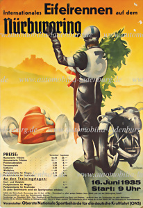 1935, original Veranstaltungsplakat "Internationales Eifelrennen auf dem Nürburgring 16.Juni.1935, Entwurf von Stürmer, 68,5x47,5cm, aufgezogen auf Hartfaserplatte, rechte obere Ecke mit kleineren Abriebstellen, ansonsten guter Zustand, selten
