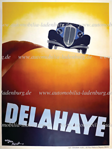 1935, beeindruckendes Werbeplaklat, Entwurf Roger Péron für den französischen Automobilhersteller Delahaye. Dieses ikonische Motiv zählt zu den berühmtesten Werken der Art déco Automobilwerbung und verkörpert auf einzigartige Weise Eleganz, Dynamik und den französischen Stil jener Zeit. Signiert und datiert unten links "Roger Péron, 1935". Diese Farbversion ist besonders selten und besticht durch frische, leuchtende Farben sowie eine hervorragend erhaltene Druckqualität, 157,5x118cm (auf Leinen)