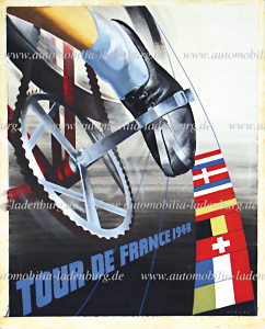 Original Plakatentwurf von Carlo Demand (1921-2000), Gouache auf Karton, geschaffen als offizieller Entwurf für das Tour de France Plakat im Jahre 1949. Das Motiv zeigt einen kraftvoll modellierten Fuß, der energisch in die Pedale eines Rennrades tritt – ein Symbol für Dynamik, Ausdauer und den unermüdlichen menschlichen Antrieb, der die Tour de France seit jeher prägt. Neben der Komposition sind acht Flaggen teilnehmender europäischer Nationen angeordnet – Frankreich, Belgien, Niederlande, Dänemark, Schweiz, Spanien und Italien – und verweisen auf die internationale Dimension des Rennens in der unmittelbaren Nachkriegszeit. Dieser Entwurf wurde allerdings nicht für das offizielle Veranstaltungsplakat auserwählt und bleibt somit ein Unikat, 52,5x42,5cm