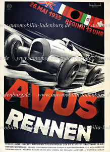 Veranstaltungsplakat zum Avus Rennen 1935, Entwurf von Klotz & Kienest. Das Motiv überzeugt durch die klare Gestaltung und eindrucksvolle Dynamik und dokumentiert die technische und gestalterische Fortschrittsbegeisterung der Zeit und gilt als eines der gefragtesten Rennplakate. Das Rennen gewann Hans Stuck auf Auto Union...seltene große Version, 120x83cm (auf Leinen)