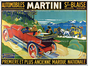 um 1910, außergewöhnlich seltenes Werbeplakat, Entwurf von Edouard Elzingre für den Schweizer Automobilhersteller Martini. Mit einer eindrucksvollen Darstellung eines rasenden offenen Martini Tourenwagens, während ein Polizist eine Postkutsche anhält um den Wagen passieren zu lassen. Ein wunderschönes, dynamisches Sinnbild für den technischen Fortschritt der Frühzeit des Automobils. Das Werk fasziniert durch seine brillianten Farben und die kraftvolle Bildsprache, die typisch für die Pionierjahre der Automobilwerbung ist, 109x147cm (auf Leinen), sehr guter Zustand