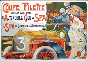 Außerordentlich seltenes Originalplakat zum "Coupe Pilette 1907", gesponsert vom Automobile Club de Spa. Eine bemerkenswerte Lithografie, die sich durch ein einzigartiges grafisches Detail auszeichnet. Das Werk fasziniert durch seine brillianten Farben und die dynamische Gestaltung, die den Pioniergeist des frühen Motorsports eindrucksvoll einfängt. Ein herausragendes Beispiel belgischer Plakatkunst der „Belle Époque“, 117x82,5cm, fachgerecht archiviert und aus dem Rahmen entfernt, extrem selten, nur wenige Exemplare bekannt